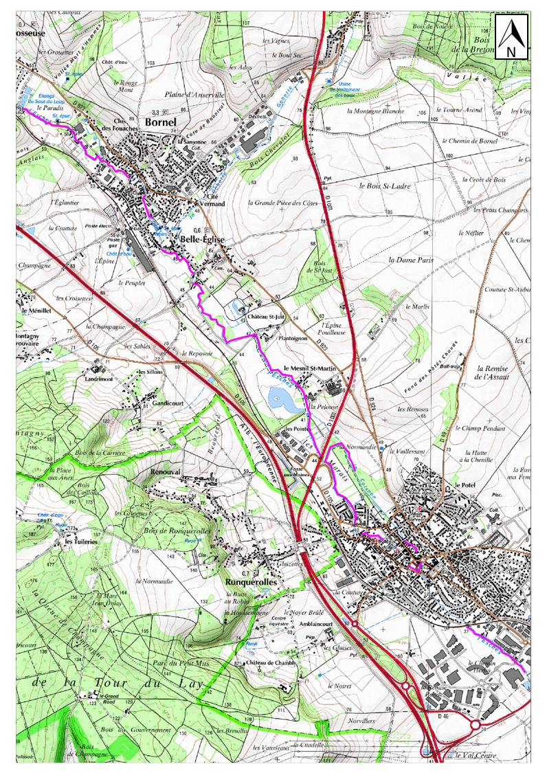 - Sur l’ensemble du parcours de la Truite Bornelloise ( en rose sur le plan )