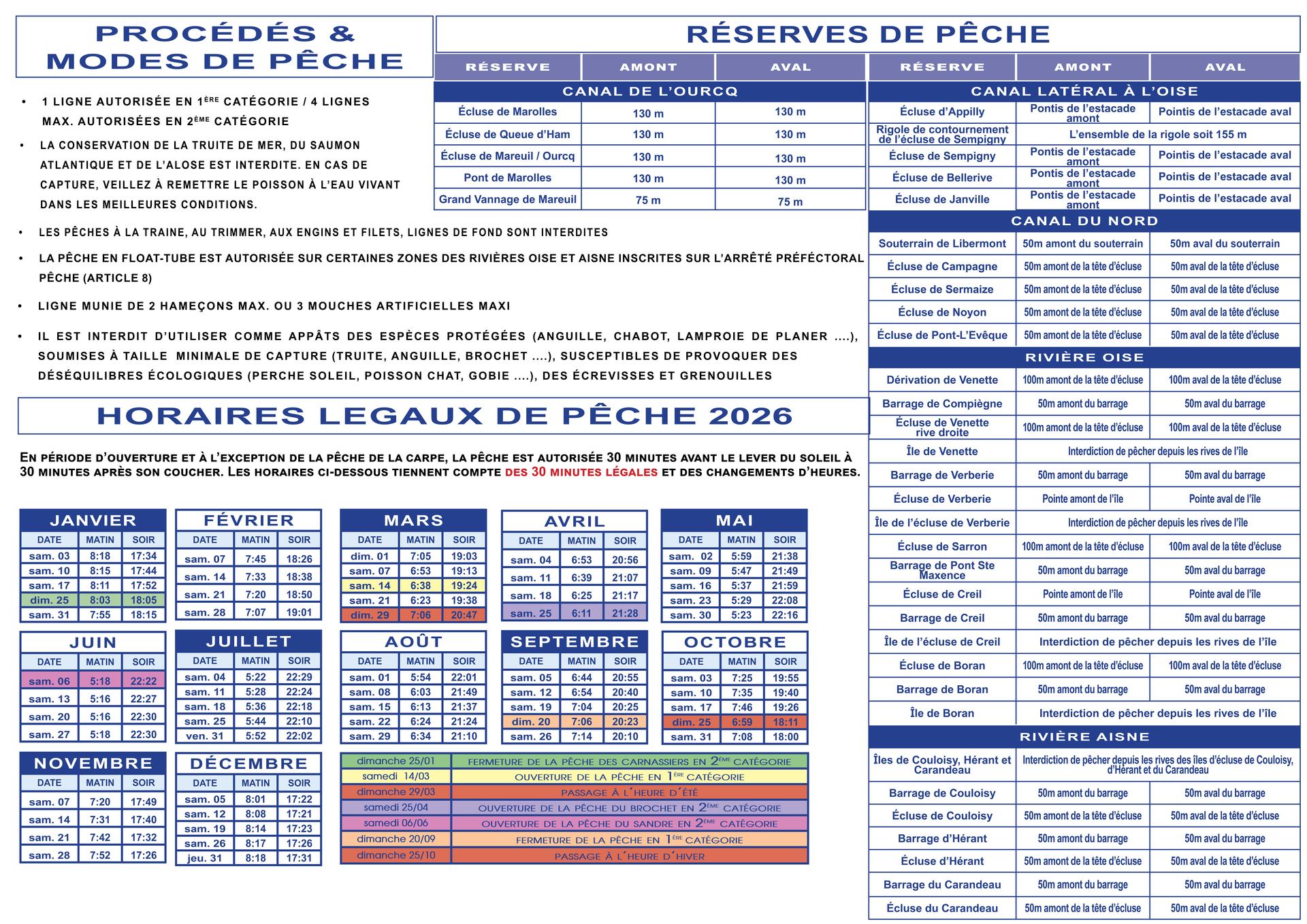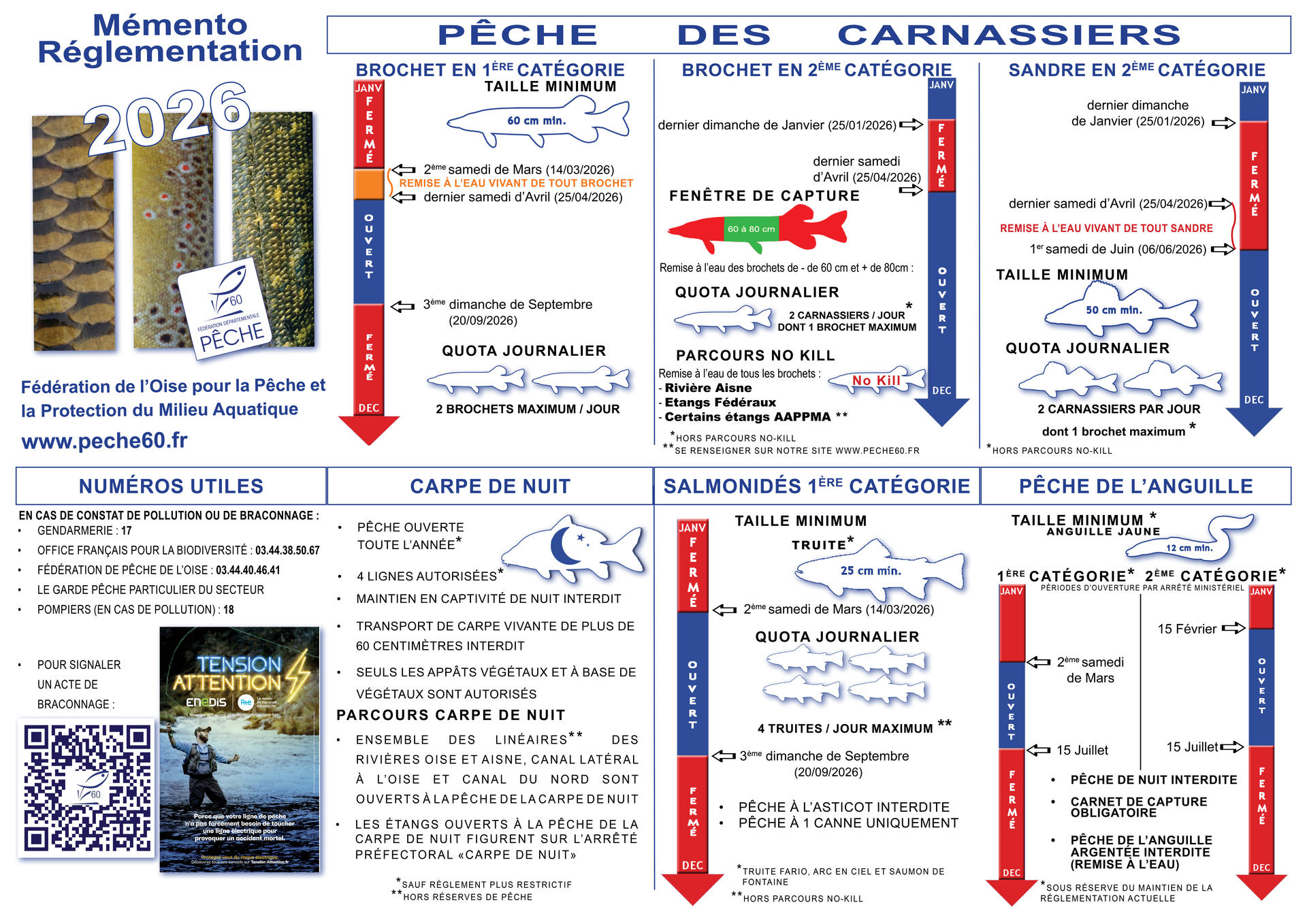 La réglementation en vigueur pour la pratique de la pêche est parfois difficile à retenir et semble flou pour les néophytes. Pour cela et afin que chacun puisse, en un coup d'oeil au bord de l'eau, se rappeler les principales règles en vigueur, la Fédération de Pêche de l'Oise met à disposition un dépliant Memento qui résume les informations fondamentales en matière de règlementation pêche dans le département de l'Oise