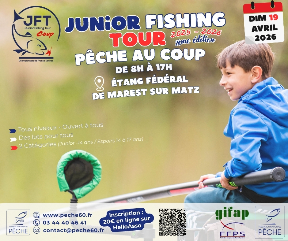 Accéder au siteLe JFT Coup est le nouveau circuit national de pêche au coup pour les jeunes pêcheurs et pêcheuses de moins de 18 ans. La seconde saison (2025/2026) débutera dans l'Oise en Avril 2026 et se clôturera en septembre 2026 par une grande finale nationale attribuant les titres de Champion(ne) de France dans les 2 catégories d’âges.